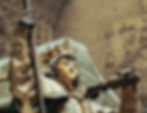 On his head, he wears a crown in the shape of a castle, with multiple turrets and blind arcades. Some of the turrets appear to have openings. Those turrets have quatrefoil windows. Look at the realism of the gloves and sleeves.